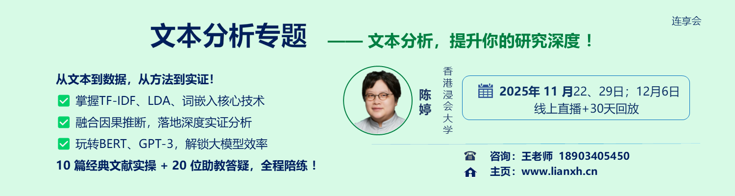 连享会最新专题课程、公开课、数据分享等。包括:DID, RDD, 因果推断, 文本分析, 机器学习, Stata/R/Python 应用等。