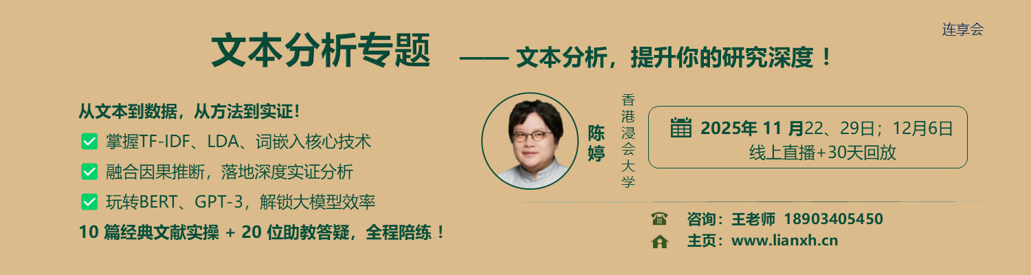 连享会最新专题课程、公开课、数据分享等。包括:DID, RDD, 因果推断, 文本分析, 机器学习, Stata/R/Python 应用等。